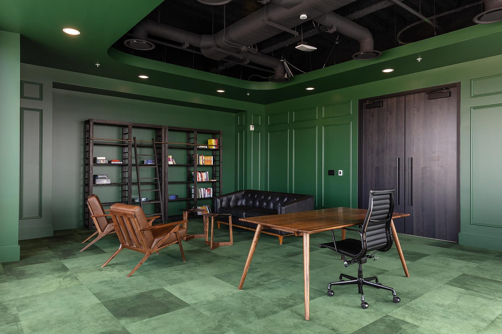 Taking initial color cues from Hub Studio’s finish palette, we refined workstation typicals and ancillary groupings in-tandem with the client, utilizing HB’s 3D modeling software and robust materials library. Making changes on-the-fly in real time with the client made the 100,000 sq. ft. project’s design process efficient and fun, while taking ambiguity out of visualizing the end result. Saturated jewel tones and elevated fabrics paired with refined wood and brass tones make for a rich, textural, and sophisticated office environment.